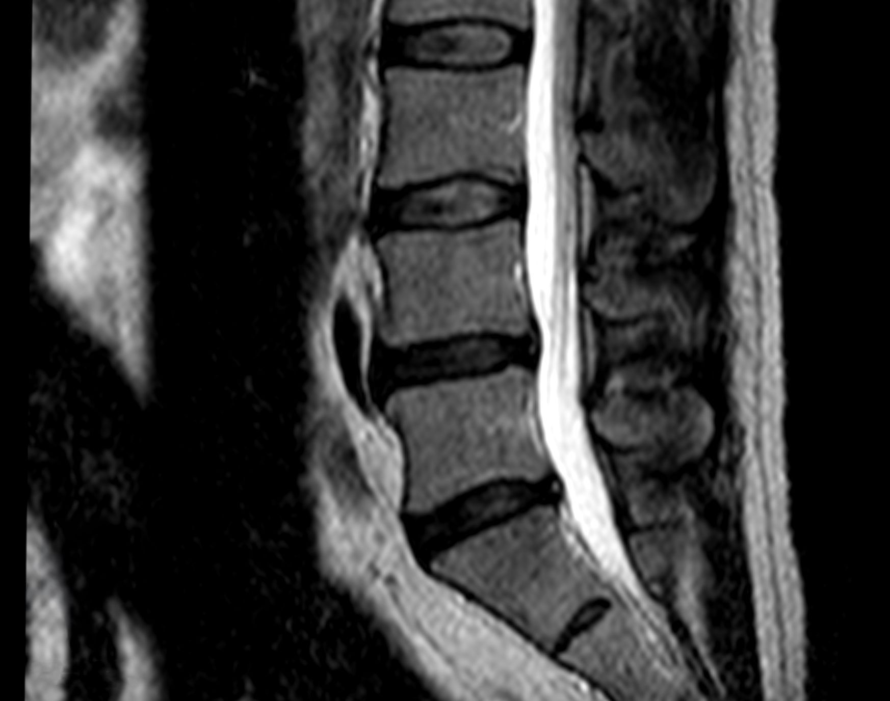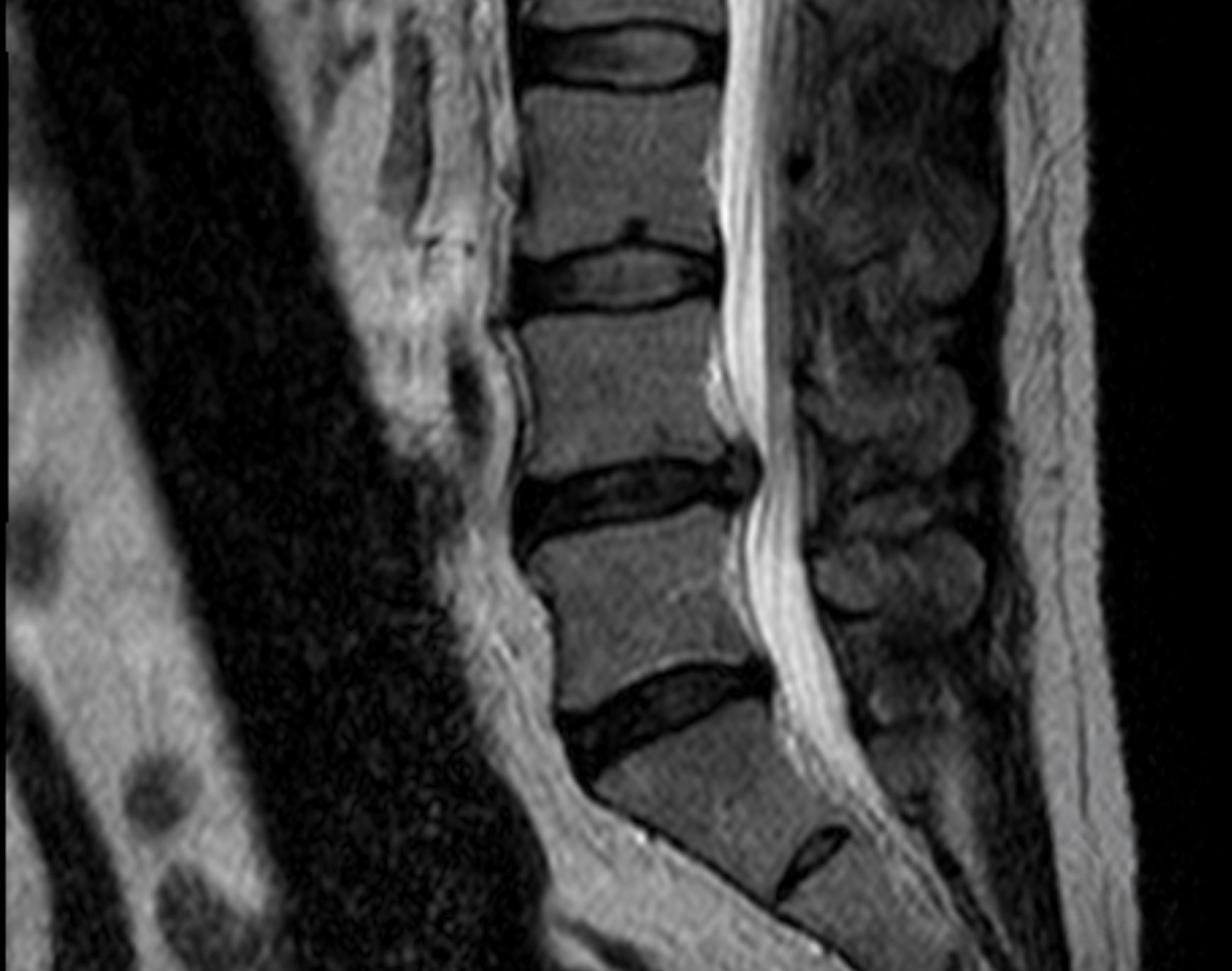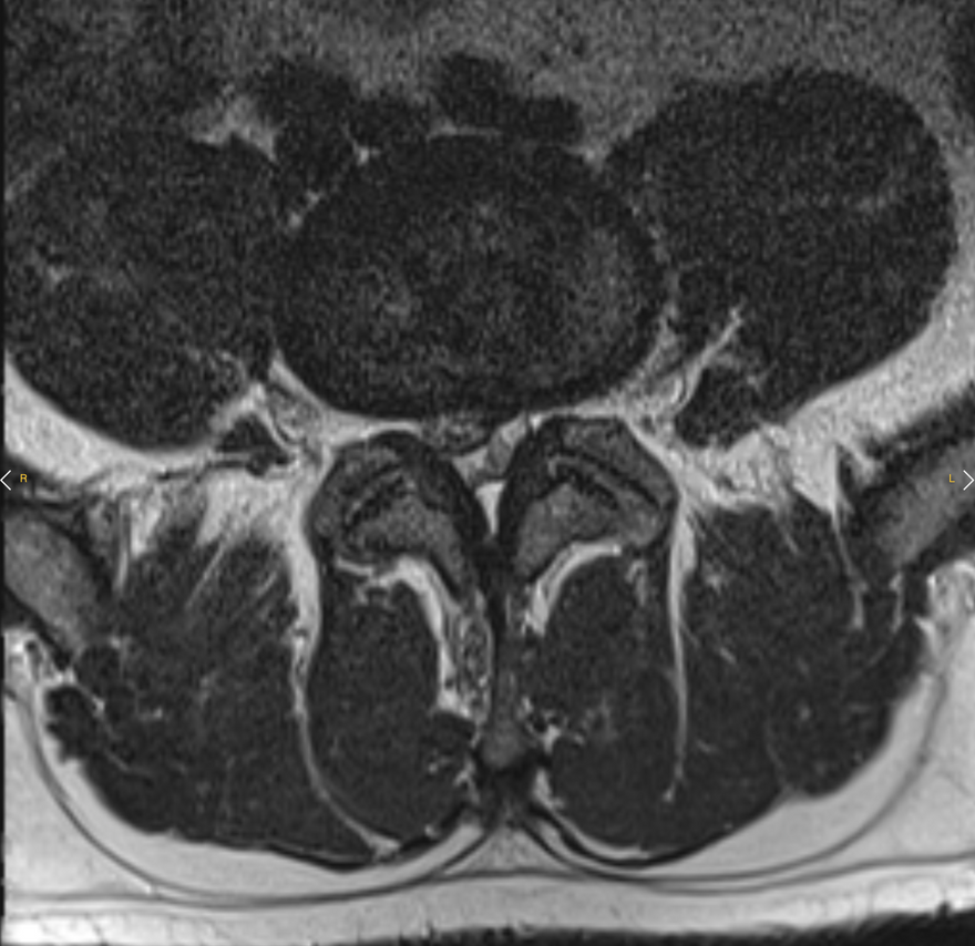 Patient de sexe masculin, âgé de 68 ans. Symptômes : Douleur lombaire gauche intense et invalidante ; le patient présente des difficultés de mouvement et de marche. Diagnostic : Hernie discale postéro-latérale gauche en L4-L5.