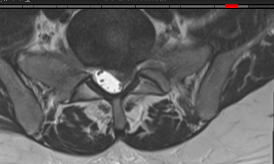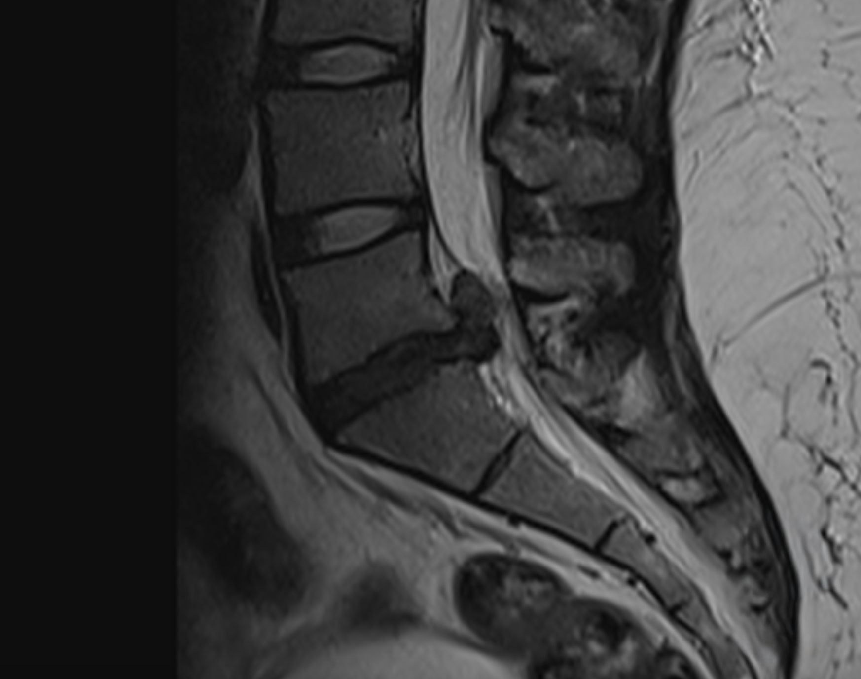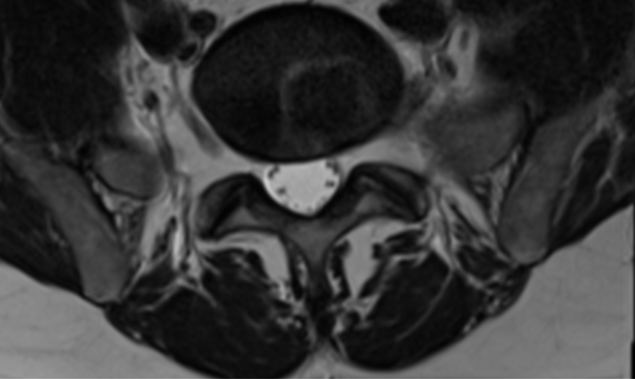 Patiente de 32 ans. Symptômes : Lombosciatique bilatérale invalidante, associée à des paresthésies et à une légère sensation de faiblesse musculaire lors de la dorsiflexion des pieds. Diagnostic : Hernie discale L5-S1 importante.